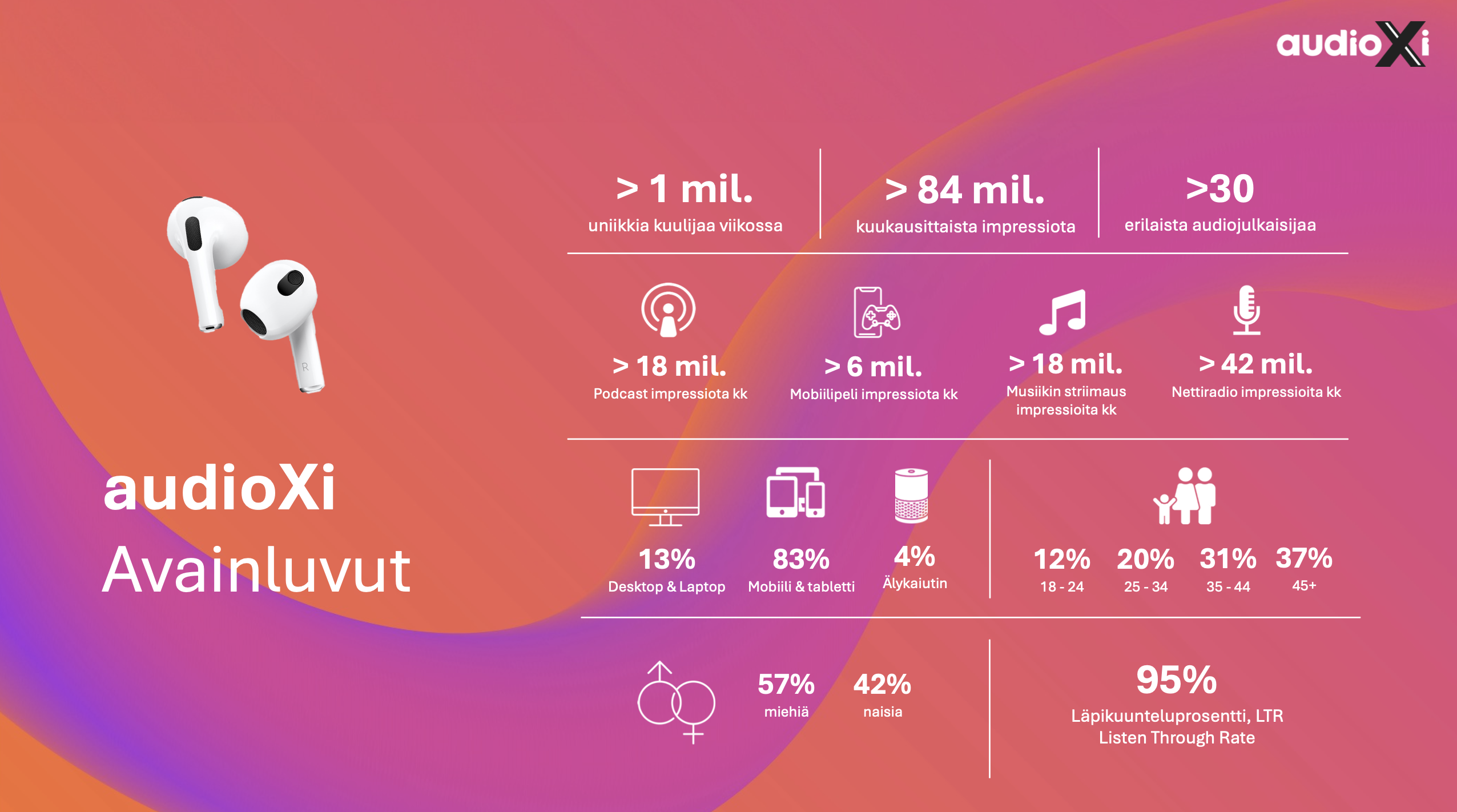 audioXi tavoittaa Suomessa valtakunnallisesti lähes miljoona uniikkia kuuntelijaa viikossa. Mainonta jalkautuu podcasteihin, nettiradioihin, musiikkistriimeihin ja mobiilipeleihin.